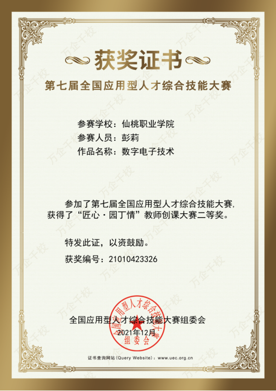 近日,在“2021第七届全国应用型人才综合技能大赛”中,机械电子工程学院教师彭莉、周子健荣获二等奖、张联荣获三等奖。