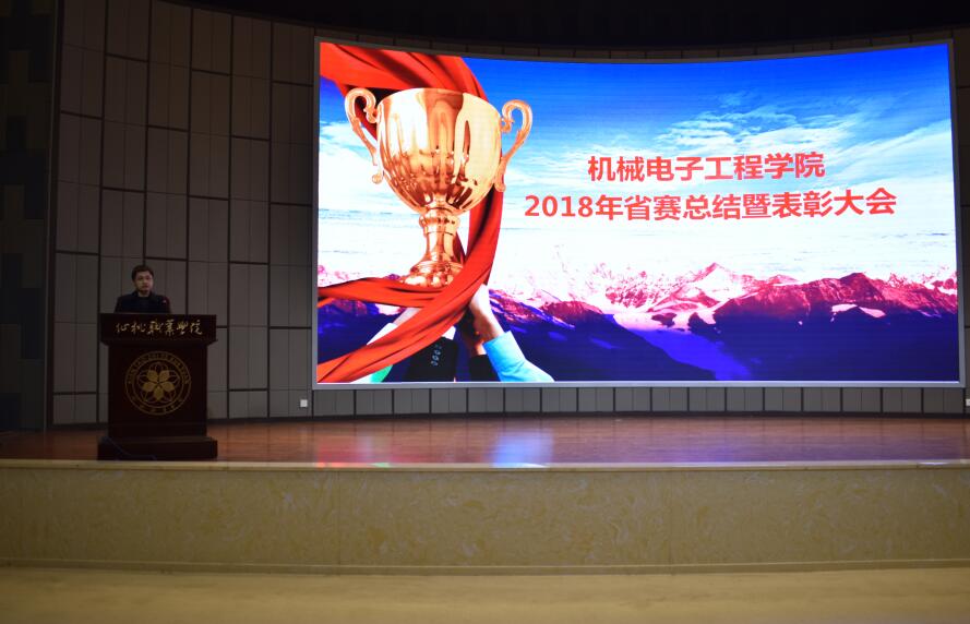 会上副院长卢社军宣读了本次省赛的表彰文件,并由各领导为各专业参赛队伍的指导教师和参赛选手颁奖。随后,物联网专业参赛学生葛霞、工业机器人专业参赛学生董国庆作为参赛学生代表上台发言,分享了在备赛和比赛期间的所得、所感。汽修教研室主任王建作为教师代表上台发言。副院长张汉飞对机电院省赛工作进行了概述:1.精心设计,培训严谨;2.突破技术,提升水平;3.精益求精,培育匠心。