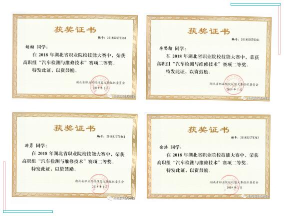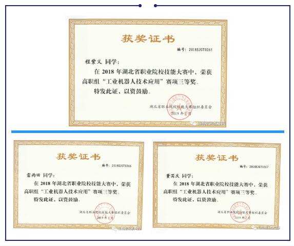 近日,省教育厅发放2018年湖北省职业院校技能竞赛获奖证书。机电院在汽车检测与维修技术赛项、电子产品设计与制作赛项、现代电气控制系统安装与调试赛项、物联网技术应用赛项、工业机器人技术应用5个赛项中获奖26人次,其中团队二等奖5项,三等奖4项。