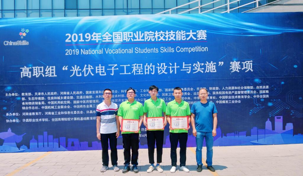 6月2日,2019年全国职业院校技能大赛高职组“光伏电子工程的设计与实施”赛项在河南许昌举行。本次赛项共有来自全国28个省、直辖市、自治区的83支代表队共249名选手参赛,校代表队机电1601班邹浩、机器人1701班李小龙、机电1701班杨茂林(指导老师光明、付晓军)排名第29名,荣获三等奖。