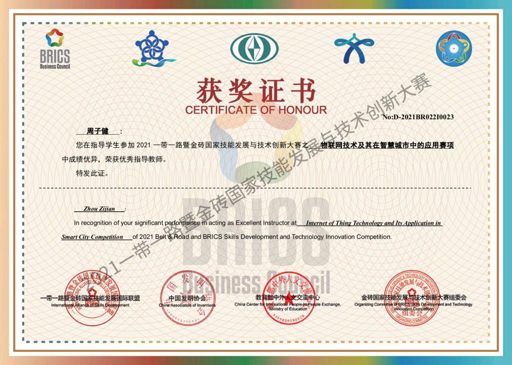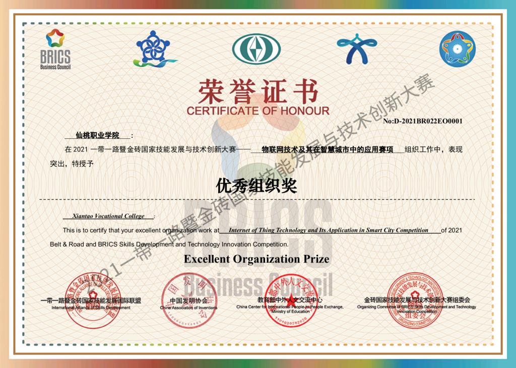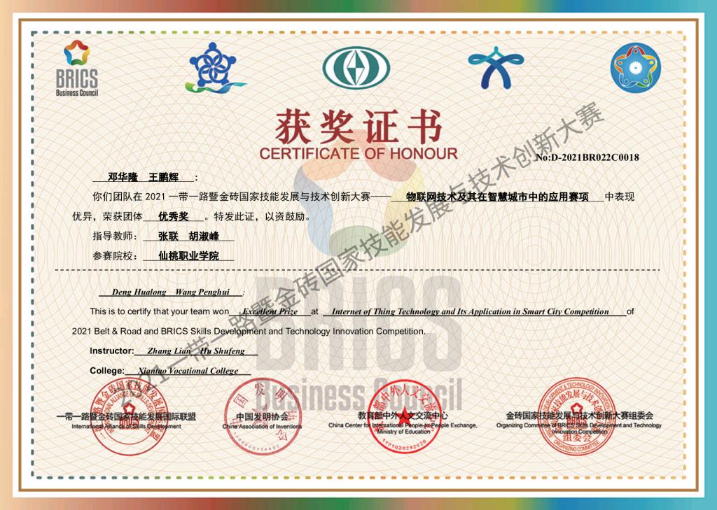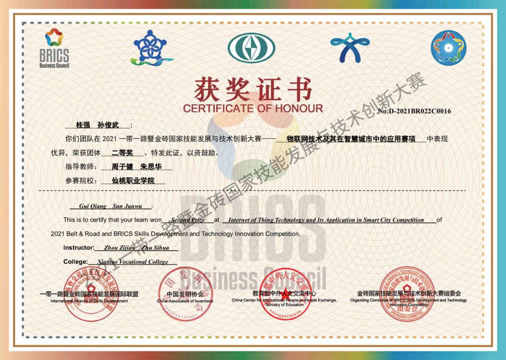 在近日举行的一带一路暨金砖国家技能发展与技术创新大赛物联网及其在智慧城市中的应用赛项中,我院机械电子工程学院物联网应用技术专业学生孙俊武、桂强组成的代表队,与来自全国72支代表队同台竞技,获得团体二等奖,周子健、朱思华获评“优秀指导教师”,学院获评“优秀组织奖”。