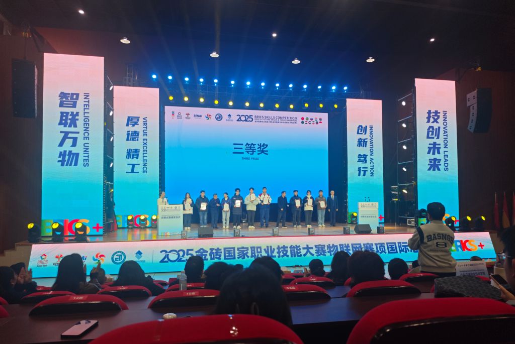 在2025年金砖国家职业技能大赛(金砖国家未来技能和技术挑战赛)物联网赛项国际总决赛中,我院物联网应用技术专业学生程鹏飞、徐凡凭借过硬的专业知识、精湛的设备操作能力和无缝的团队配合,获总决赛三等奖。