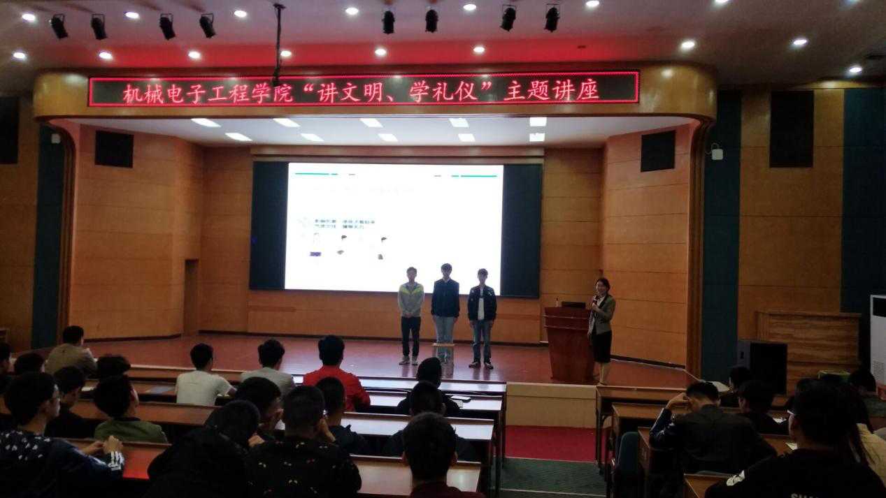 讲座在机械电子工程学院党总支副书记肖少华上台致辞中拉开序幕。肖书记一方面表达自己对本次主题讲座真挚的祝贺,同时另一方面也表达出自己出机电院学子们最殷切的期望,那就是希望同学们都能够讲文明、学礼仪,在学习和生活中懂礼仪、学礼仪、重礼仪。由仙桃职业学院语委办主任、国家级普通话测试员刘彩蓉老师带领在座的机电学子一起了解文明礼仪的知识,现场气氛活跃,欢声笑语。