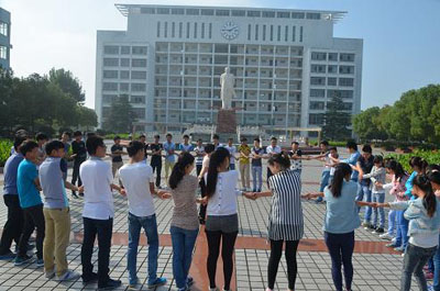 早上九点,户外拓展活动在国旗广场正式拉开序幕。教练先让大家进行了“大风吹”等一系列的欢快活动,旨在打破人与人之间的隔阂,建立相互信任的基础,营造团队快乐和谐的氛围。而后,按照教练的指示,大家随机分成了三个小组,完成了从开始的小团体“团队展示”到“解救密码”、“生产线”环节三组的PK对擂,再到最后的“兔子舞”集体协作活动。通过以上项目的训练,经历了团队的生成、展示、整合,各成员看到了本组的优劣势,在体验着奉献、协作、勇气带来的成功喜悦后,每个人深刻感受到“责任、协作、自信”的精髓。