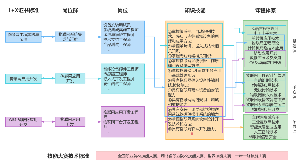 围绕国家数字经济发展及产业数字化转型升级的重大需求,面向计算机、电子信息、自动化等行业的物联网安装调试员、物联网工程技术人员、计算机网络工程技术人员、计算机硬件工程技术人员、嵌入式系统设计工程技术人员等职业,能够从事物联网设备安装配置和调试、物联网系统运行管理和维护、物联网系统应用开发、物联网项目规划和管理等工作的高技能人才。