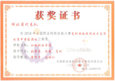 2018年代表湖北高职院校参加全国物联网大赛获国家三等奖