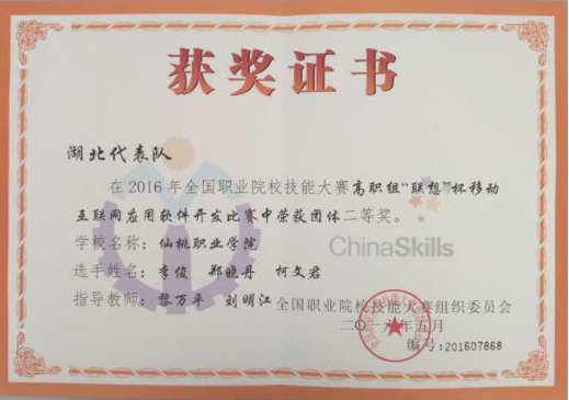 2016年代表湖北高职院校参加全国物联网大赛获国家二等奖